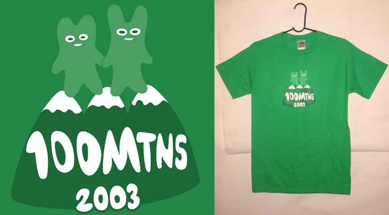 I designed this T-shirt for my parents. They are avid hikers and for years have been climbing the "100 excellent mountains" of Japan. This year (2003), they have finally finished hiking all of them and this shirt was made to commemorate the occasion. I have printed a few extra shirts in case you like the design and want to tell this little story behind the design to your friends.